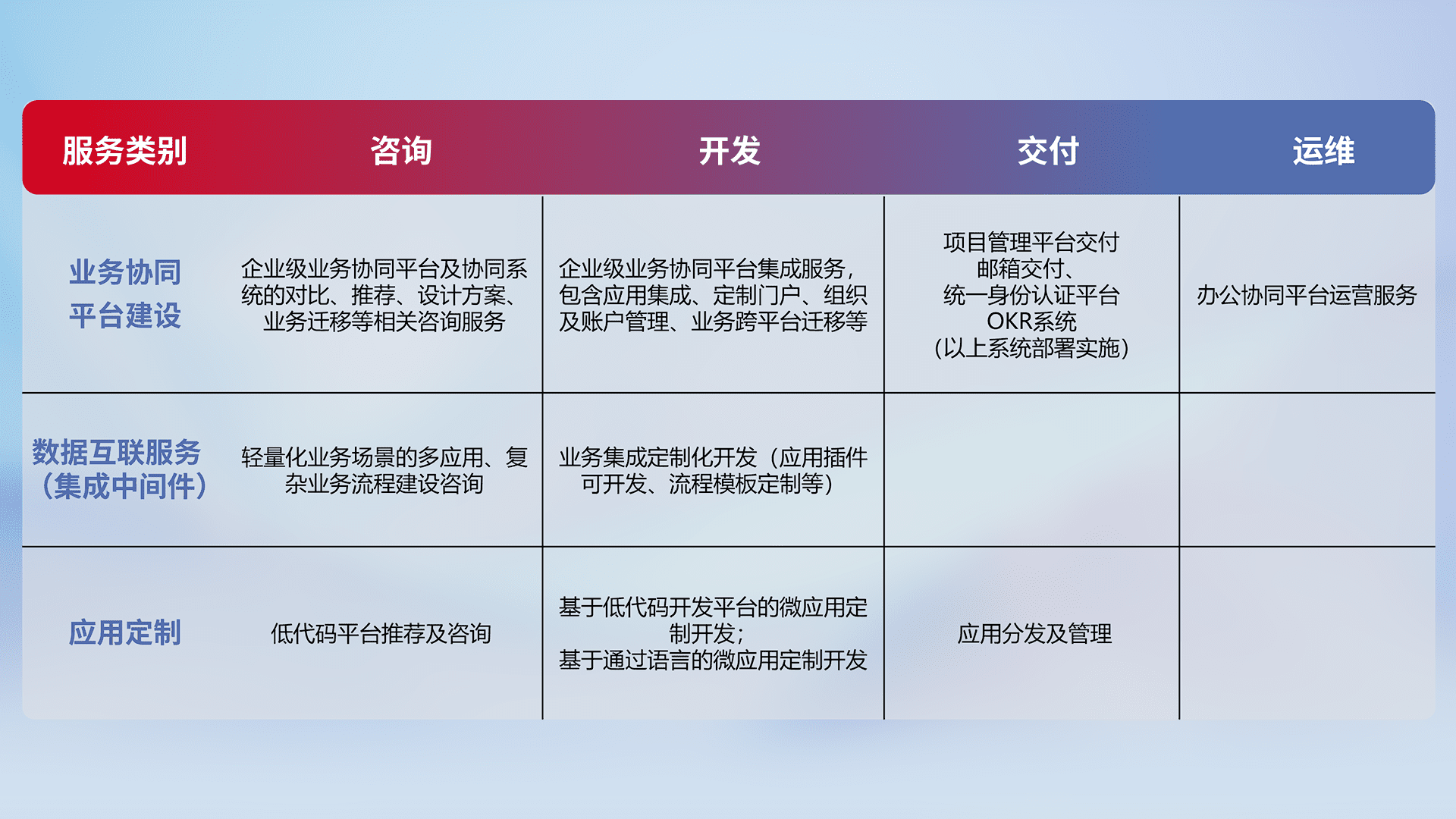 针对钉钉、、、、企微、、、、IDaas等平台级产品提供产品的规划、、、、方案、、、交付、、、、定制化开发等服务,,实现如统一协同办公、、、、智能客户服务、、、、混合会议管理、、、、智能数据查询、、、、等业务场景,,,实现数字化转型。。。。