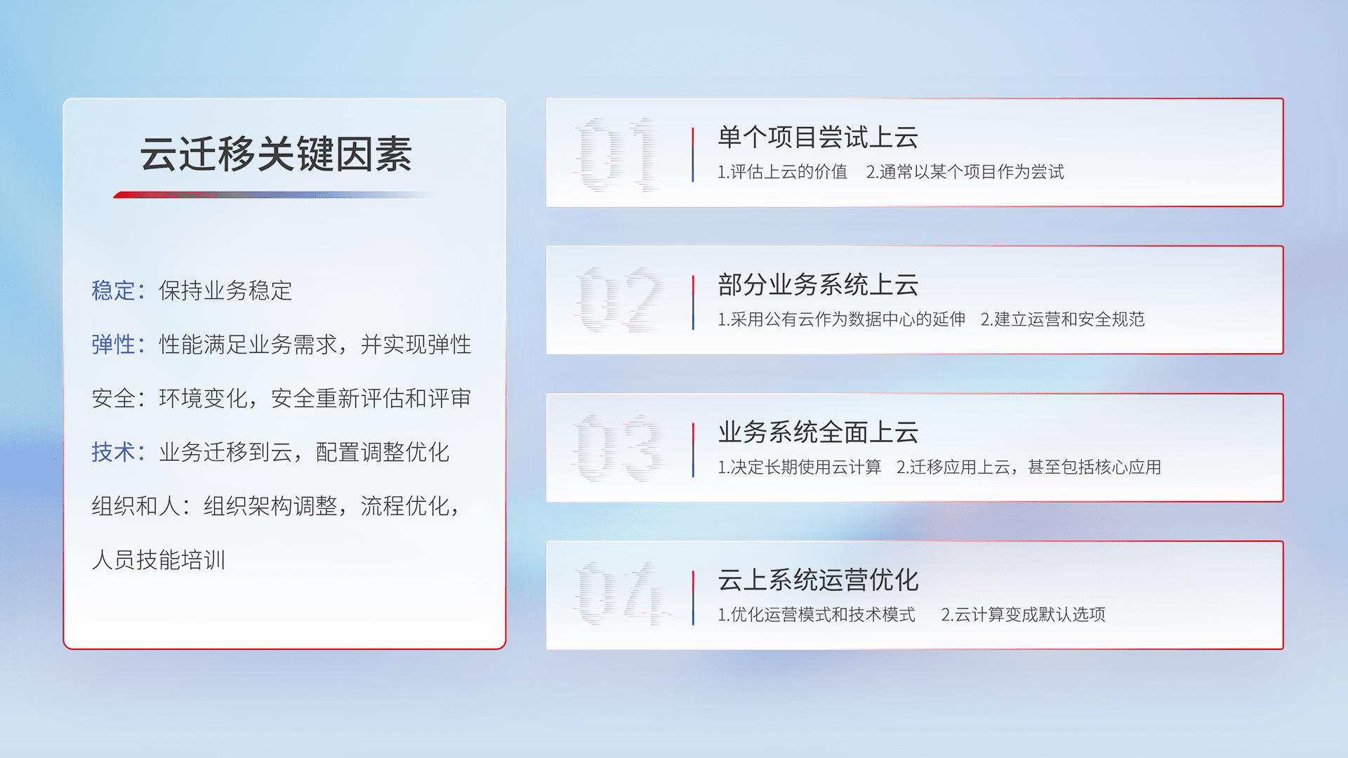 结合实际业务,,从规划设计、、云平台选型、、云原生改造、、、、数据迁移、、、集成交付,,,迁移全过程为客户识别最佳上云路径,,,,做好风险识别管理,,,设计网络架构、、、身份权限、、安全审计合规、、操作审计、、、日志审计、、、监控告警策略、、、多站点容灾设计等,,,,对云上基础设施进行整体规划,,,提升IT治理水平,,,,以满足弹性、、高可用、、高性能的需求。。。
