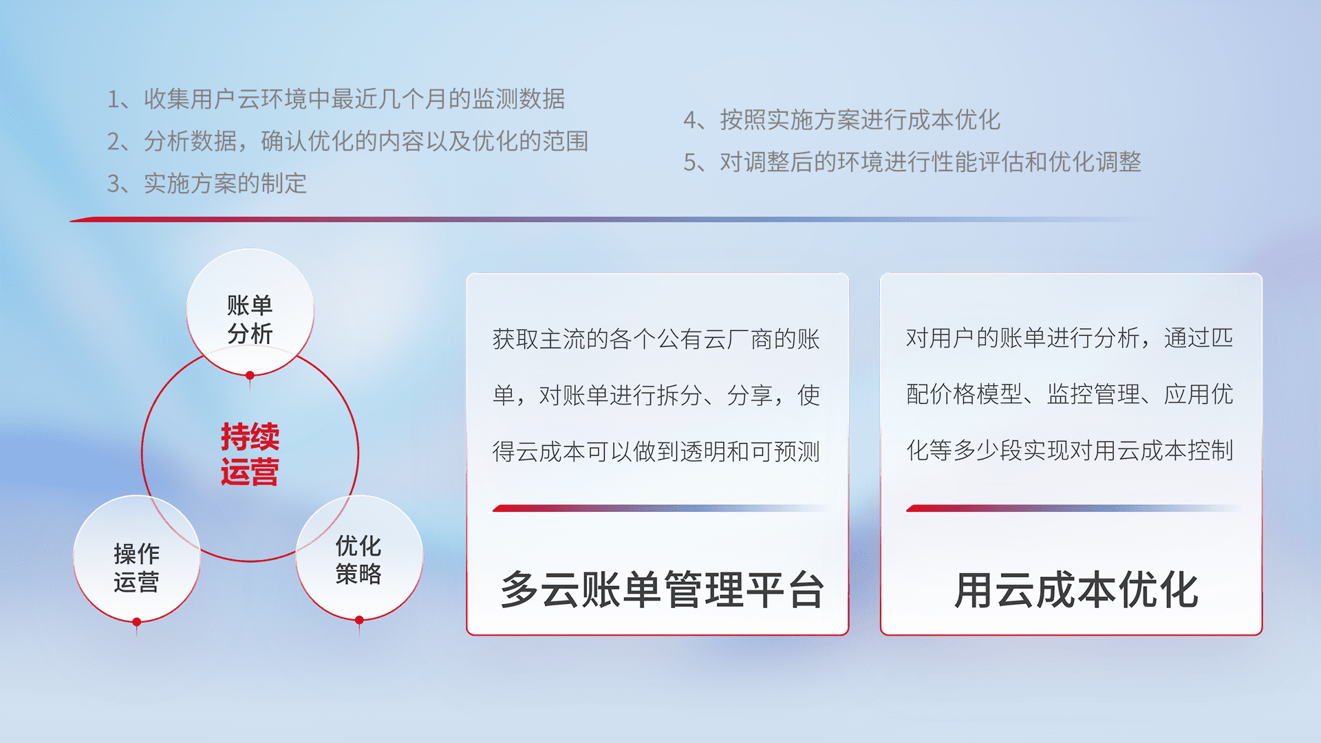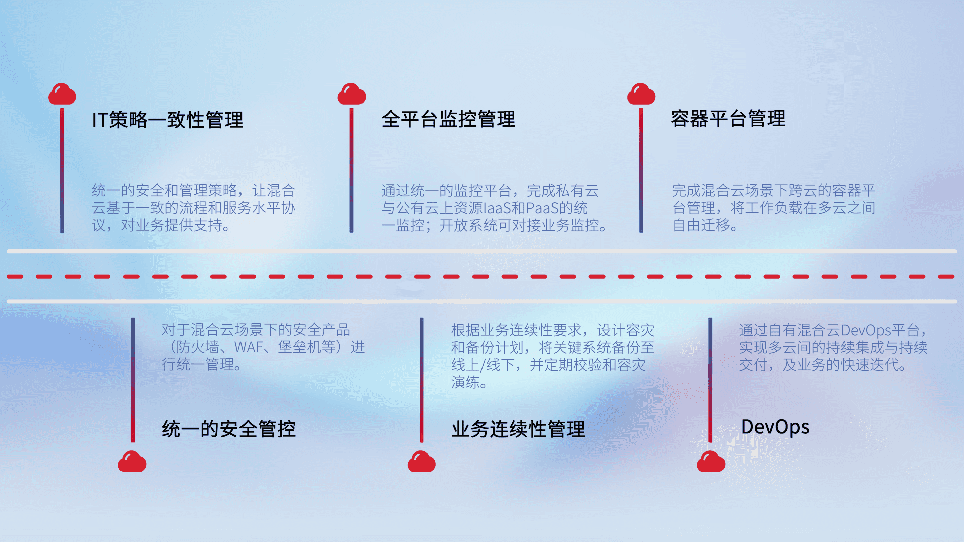 通过多云纳管,,以统一的资源数据模型把客户的云资源进行抽象和封装,,,,进而实现对多云资源的统一操作,,,,保障云资源管理的可靠性、、、稳定性与可用性。。。。量身定制化运维内容,,,,配置、、开发运维、、补丁管理、、、、备份、、监控、、、、认证和访问管理、、审计和日常巡检等,,,保障在用云过程中的可靠度,,稳定度以及高可用率。。。
